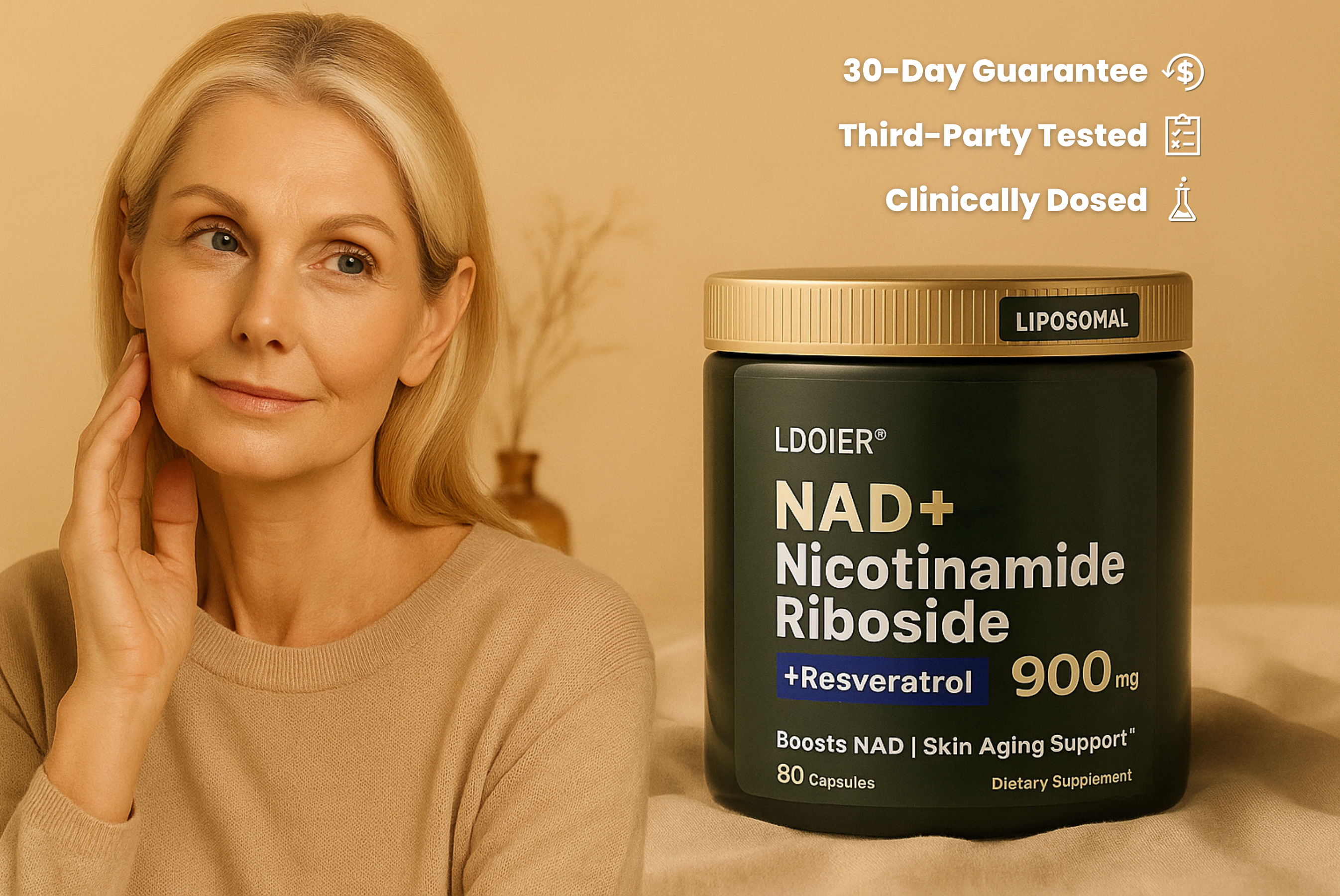 Our formula is designed to directly combat NAD decline. It features Nicotinamide Riboside (NR), a powerful ingredient that helps your body create more NAD. We've also included Resveratrol, a well-known antioxidant that supports healthy aging and enhances NAD's benefits. Together, they work to revitalize your cells from within, promoting smoother skin, more energy, and a brighter appearance.